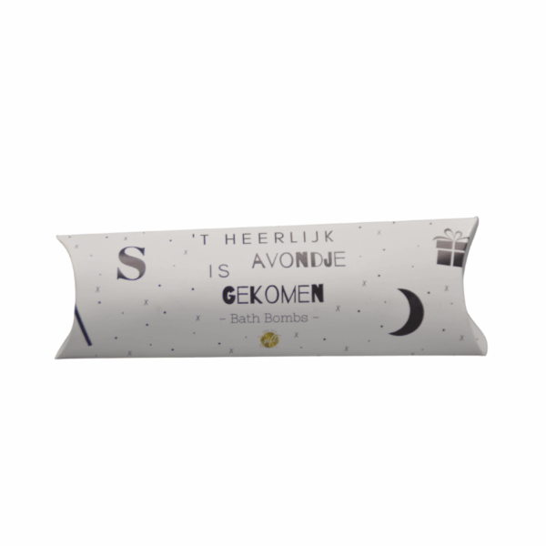 De bruisballen van The Big Gifts met de tekst “’t heerlijk avondje is gekomen” zijn uitgevoerd in wit met een patroon van zwarte stipjes. Deze bruisballen zorgen voor een ontspannen en feestelijk moment tijdens het sinterklaasseizoen en zijn perfect om cadeau te geven of zelf van te genieten.