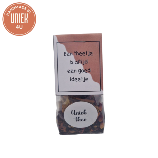 Geniet van een warm moment met onze thee: “Een theetje is altijd een goed ideetje”. Deze heerlijke thee is perfect voor elke theeliefhebber. Leuk om zelf van te genieten of om cadeau te geven. De vrolijke tekst op de verpakking zorgt meteen voor een glimlach. Ideaal voor een gezellig thee-moment!