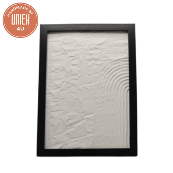 Minimalistisch abstract kunstwerk in wit, met een rustige en moderne uitstraling. Door het subtiele ontwerp past dit item makkelijk in verschillende interieurstijlen, van modern tot Scandinavisch. Mooi om neer te zetten of op te hangen als verfijnde decoratie. Afmeting: 32 x 23 cm.