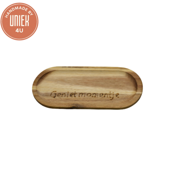 Deze houten borrelplank van Uniek heeft een mooie tekst Geniet momentje en is perfect voor het serveren van hapjes, kaas of kleine lekkernijen. Door het compacte formaat is hij ook leuk als decoratief item in de keuken of op tafel. Een sfeervolle en liefdevolle plank voor een gezellig borrelmoment.