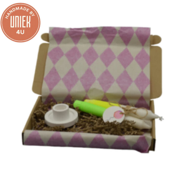 Dit vrolijke brievenbus doosje van Uniek is een liefdevol en uniek cadeautje. Het doosje bevat twee handgedipte kaarsen en één handgegoten kaarsenhouder, gemaakt van kaarsvet en gips. De set is uitgevoerd in de frisse kleuren groen, geel en wit en past gemakkelijk door de brievenbus.