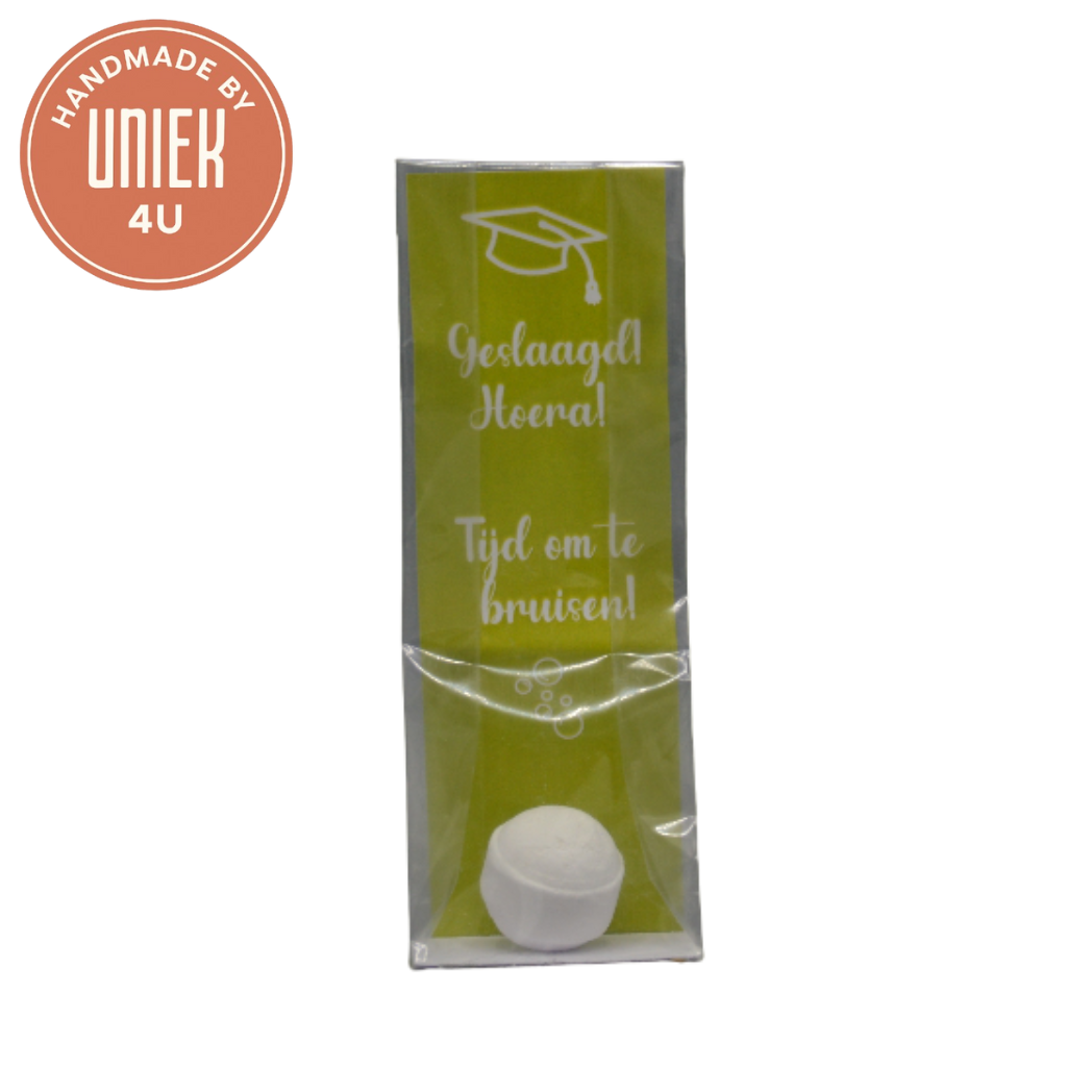 Dit bruisballetje van Uniek is handgemaakt en uitgevoerd in wit met de tekst “Geslaagd! Hoera! Tijd om te bruisen!” op een lichtgroen kaartje. Het wordt geleverd in een zakje met een afmeting van 15 x 5,5 cm. Dit feestelijke cadeautje is ideaal om een geslaagde prestatie op een originele manier te vieren.