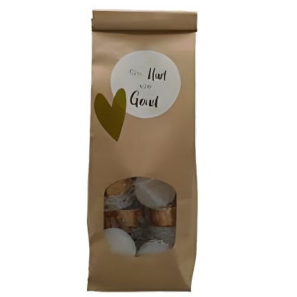 Geef warmte en sfeer met deze handgemaakte cadeauverpakking van Uniek. De lichtbruine papieren zak (23 x 9 cm) is voorzien van de tekst “Een Hart van Goud” en gevuld met theelichten in diverse dessins. Een charmant en betekenisvol presentje om iemand mee te verrassen.