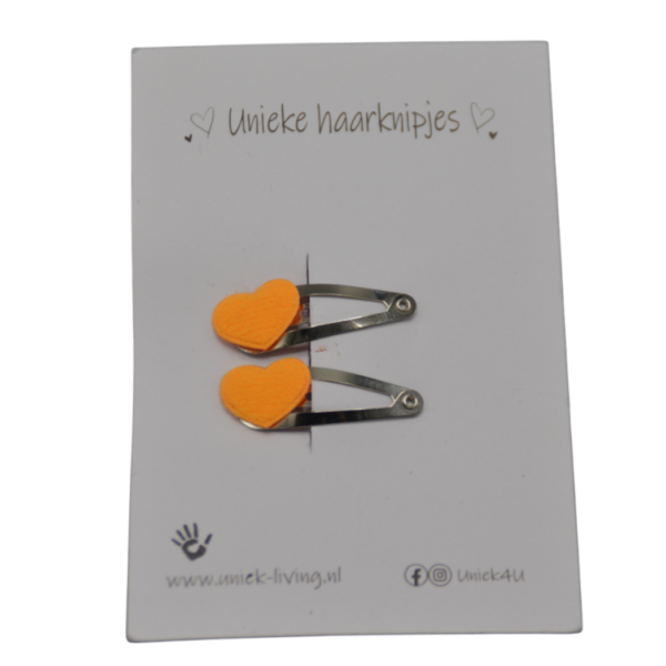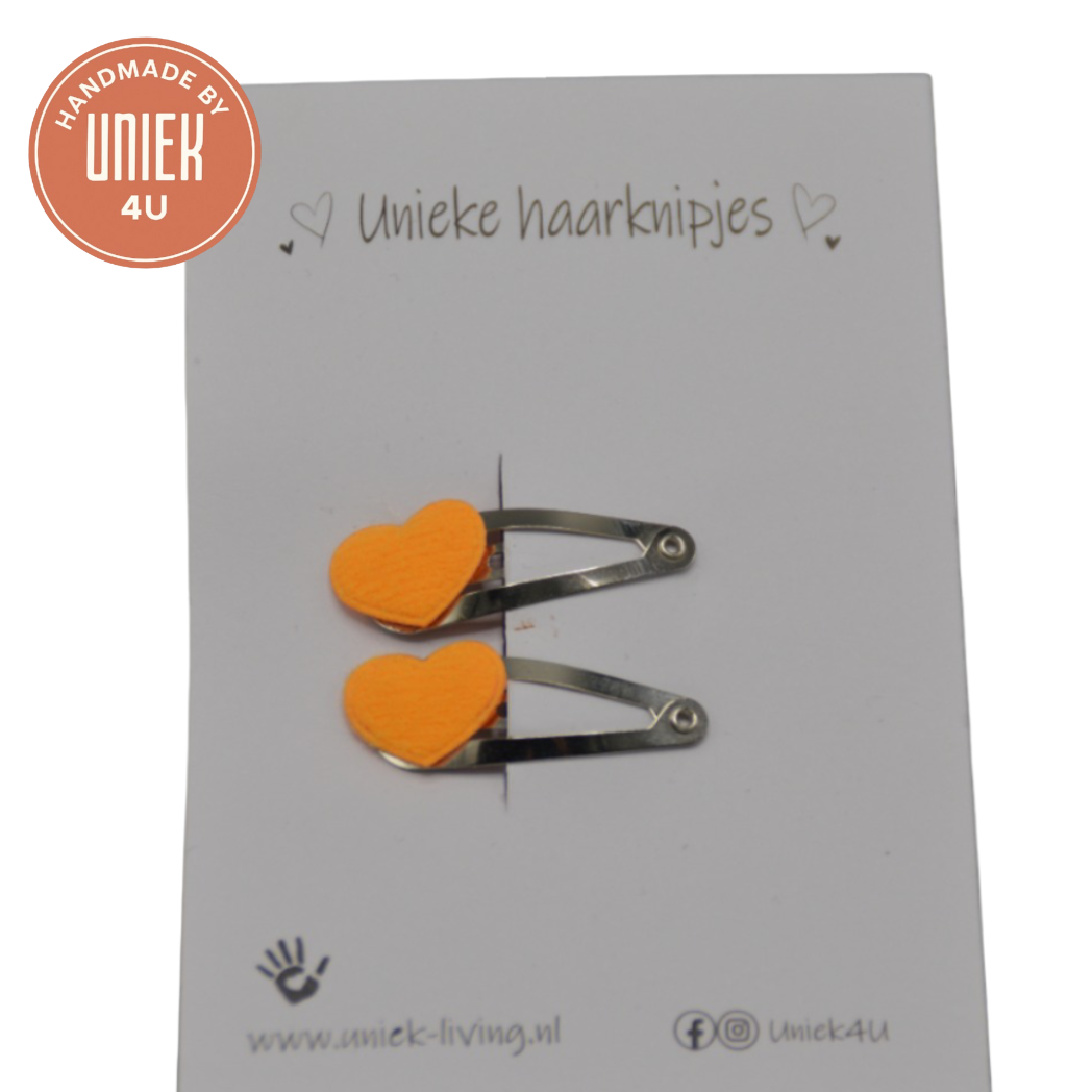 Deze vrolijke haarknipjes van Uniek zijn versierd met een oranje hartje van zacht vilt. Het speelse ontwerp en de warme kleur maken ze een leuke toevoeging aan elk kapsel. Met een formaat van 3,5 cm zijn de knipjes subtiel maar goed zichtbaar en blijven ze stevig in het haar zitten. Perfect voor dagelijks gebruik of als lief detail bij een outfit.