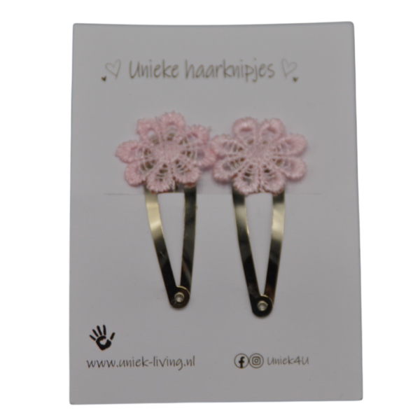Deze lieve haarknipjes van Uniek zijn versierd met een roze kantbloemetje en geven elke look een zachte, romantische uitstraling. Het bloemetje heeft een fijne afwerking en is perfect voor zowel dagelijks gebruik als feestelijke momenten. Met een formaat van 5,5 cm vallen de knipjes mooi op en blijven ze goed op hun plek. Een charmant accessoire voor jong en oud.