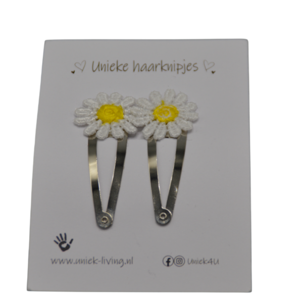 Deze vrolijke haarknipjes van Uniek zijn uitgevoerd in wit met geel en hebben de vorm van een bloem. Het frisse kleurcontrast zorgt voor een speelse en zomerse uitstraling. Met een formaat van 5,5 cm zijn de knipjes goed zichtbaar en blijven ze stevig in het haar zitten. Perfect als lief detail voor dagelijks gebruik of een zonnige outfit.