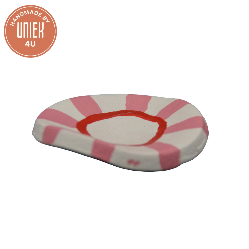 Dit handgemaakte schaaltje van Uniek heeft een speels roze met wit design en een ronde vorm van 7 x 7 cm. Ideaal voor het opbergen van sieraden, kleine hapjes of als decoratief accent. Elk schaaltje is uniek en met zorg vervaardigd.