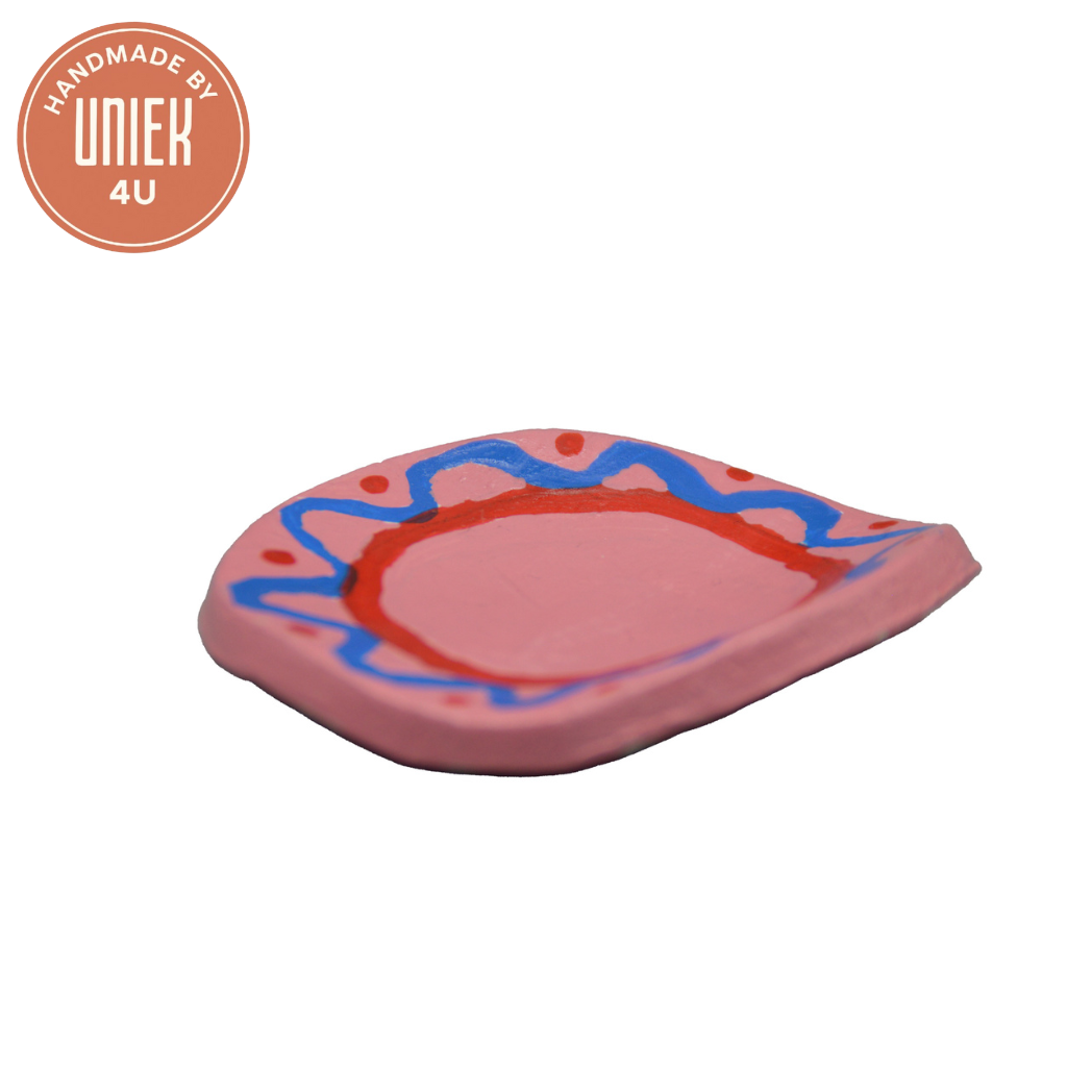 Dit handgemaakte schaaltje van klei door Uniek heeft een zachte roze kleur en is afgewerkt met een subtiele versiering. Dankzij de ronde vorm en het compacte formaat van 7 x 7 cm is het ideaal voor sieraden, kleine hapjes of decoratie. Een charmant en uniek detail voor elk interieur.