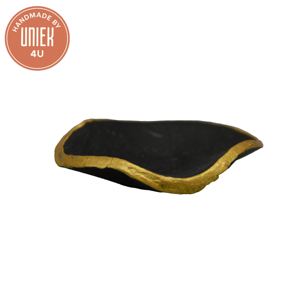 Dit handgemaakte schaaltje van klei door Uniek is uitgevoerd in stijlvol zwart klei met een subtiel gouden randje. Met zijn ronde vorm en formaat van 7 x 7 cm is het ideaal voor sieraden, kleine hapjes of als decoratief detail. Een elegante en unieke toevoeging aan je interieur.