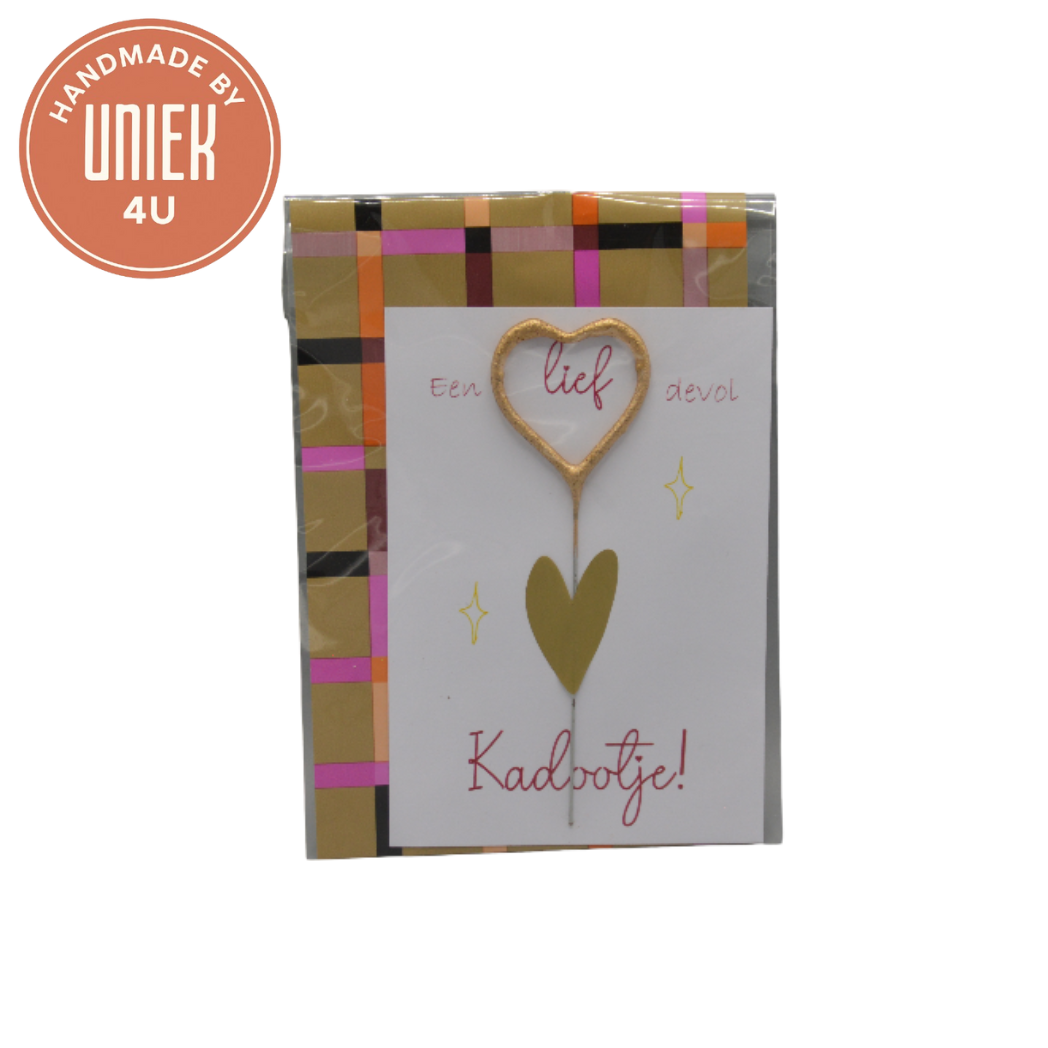 Dit sterretje in hartvorm van Uniek is handgemaakt en uitgevoerd in goud met de tekst “Een liefdevol kadootje!” op een bijgevoegd kaartje. Het product heeft een afmeting van 17,5 x 12,5 cm en combineert een sfeervol sterretje met een persoonlijke boodschap. Een stijlvol en liefdevol geschenk voor iedere gelegenheid.