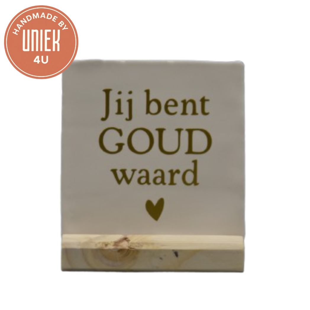 De Uniek tegel met tekst is een vierkante tegel van 10 x 10 cm, uitgevoerd in de kleuren wit en goud. Deze decoratieve tegel is gemaakt van tegelmateriaal en heeft een rustige en stijlvolle uitstraling. Door het compacte formaat is de tegel eenvoudig te plaatsen in elk interieur. Een subtiel decoratief item met een luxe uitstraling.