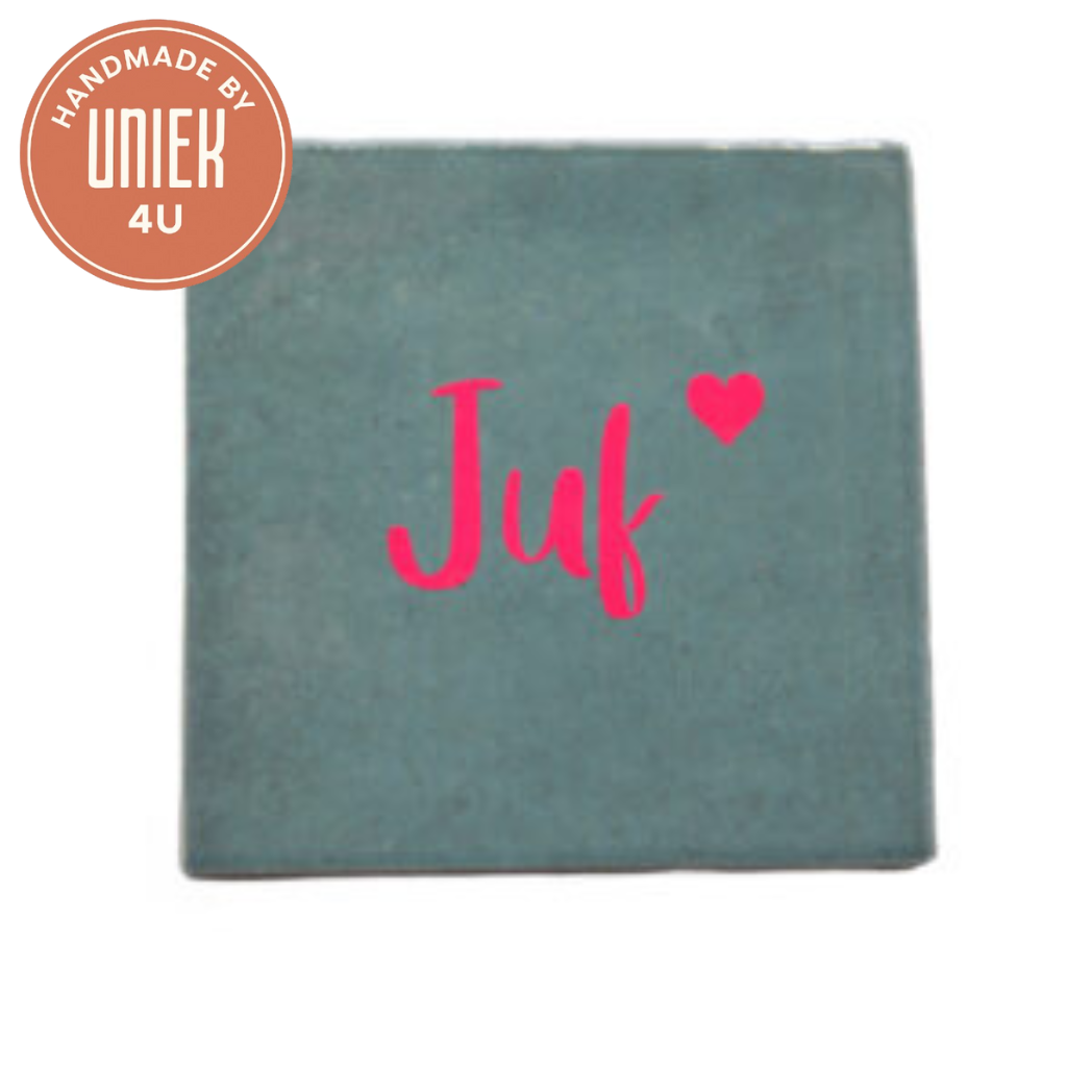 De tegel van Uniek met de tekst “Juf” is vierkant en heeft een afmeting van 10 x 10 cm. Uitgevoerd in grijs met roze letters en een klein roze hartje bij de tekst, past deze tegel perfect binnen het thema Meesters & Juffen. Een lief en persoonlijk decoratief cadeau om waardering te tonen aan een juf.