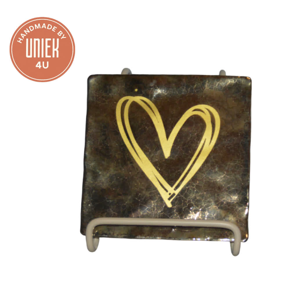 Dit handgemaakte keramieken tegeltje heeft een vierkante vorm van 10 x 10 cm en is goud van kleur. Het ontwerp met hartje geeft een warme en liefdevolle uitstraling, perfect als decoratie of als bijzonder cadeau.