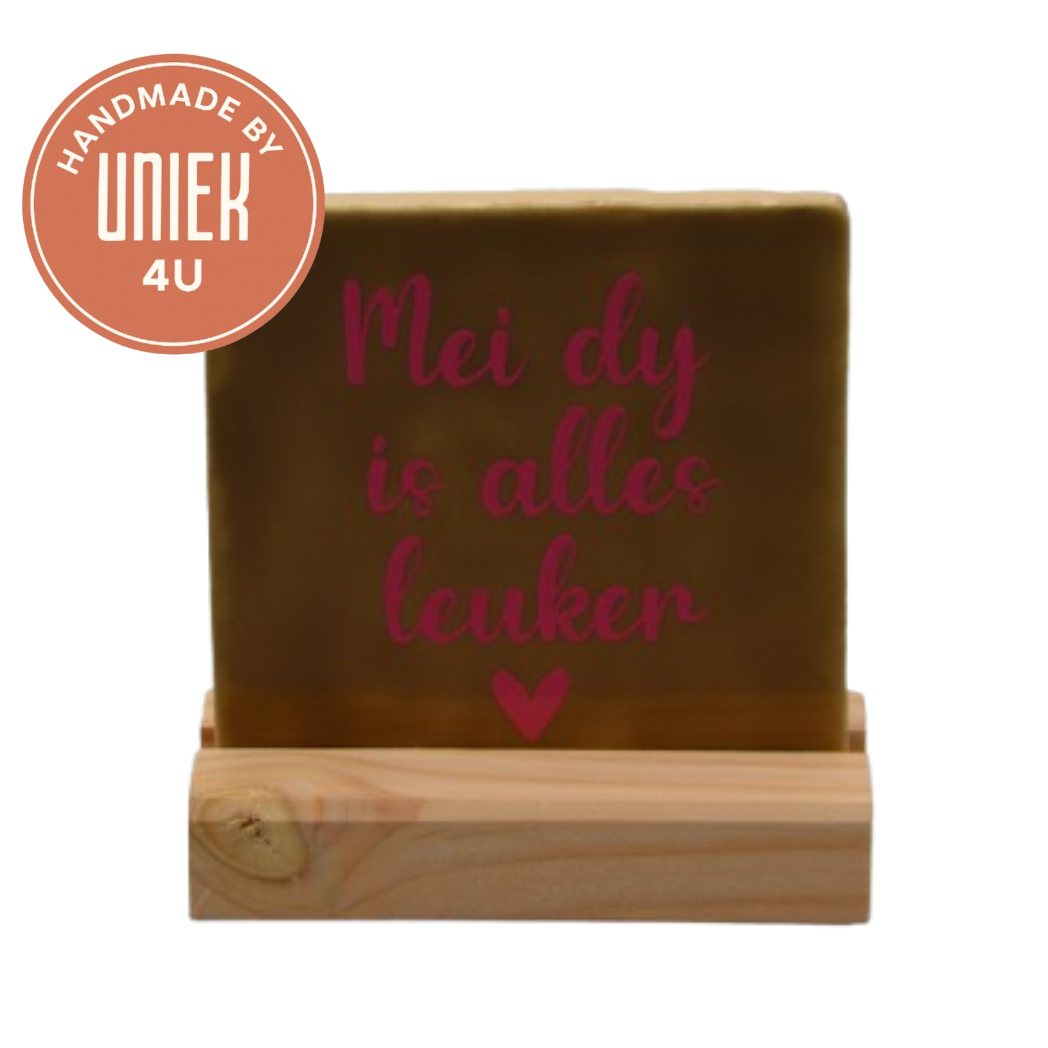 Mooi keramieken tegeltje van Uniek met de Friese tekst “Mei dy is alles leuker” in roze letters. Het tegeltje heeft een bruine achtergrond, een vierkante vorm en een afmeting van 10 x 10 cm. Een warm en liefdevol item voor in huis, leuk om neer te zetten of op te hangen. Ook perfect als persoonlijk cadeautje.