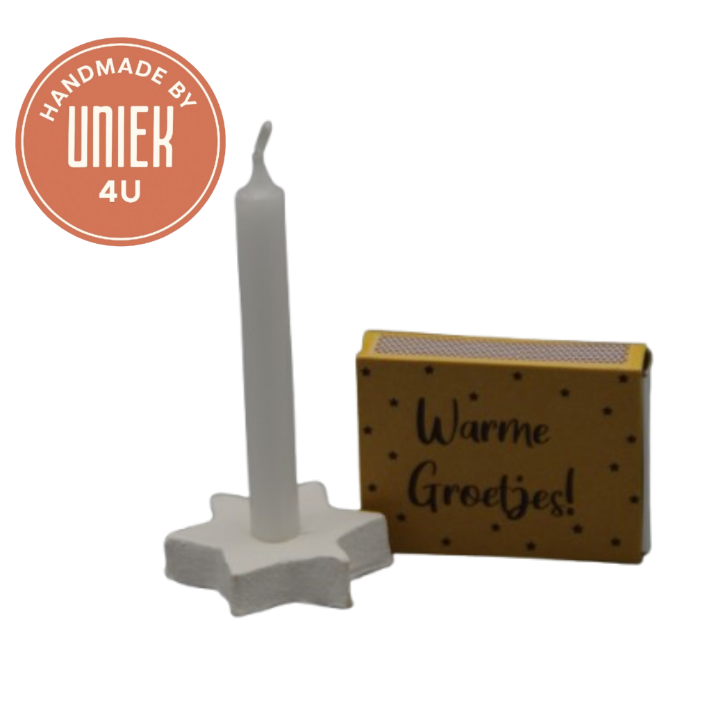 Uniek – Zakje met kaarsje, kaarshouder en lucifers – Warme groetjes! – Wit