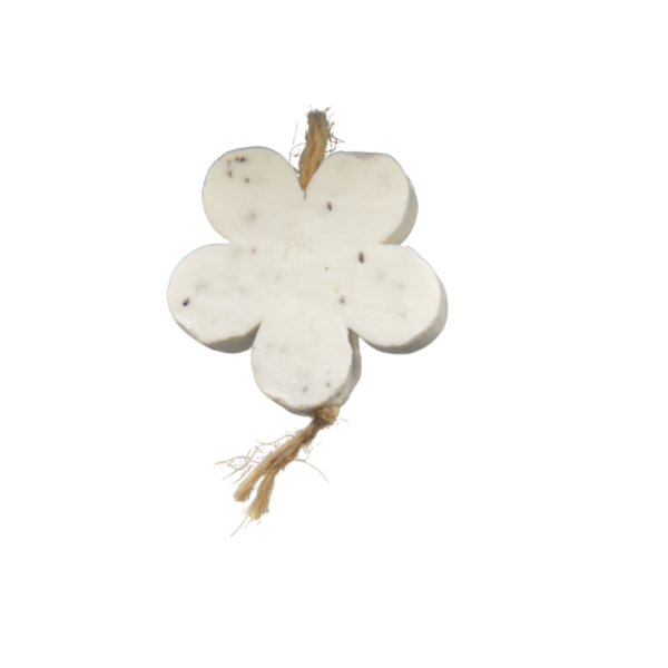 Lief zeephangertje van Uniek in de vorm van een bloem. Het zeepje is uitgevoerd in tijdloos wit en hangt aan een koordje, ideaal voor in de badkamer, het toilet of als decoratief accessoire. Compact, fris en perfect als klein cadeautje.