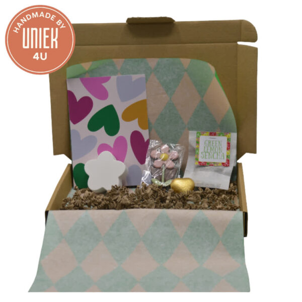 Het Uniek4U brievenbusdoosje Hartjes is een rechthoekig doosje van karton met een afmeting van 23,5 x 16 cm. Dit product bevat een Heyday kaartje, een gipsen kaarthouder, 2 chocolaadjes en een zakje Green Lemon Sencha thee. Een handzaam en sfeervol cadeau om iemand mee te verrassen. Perfect voor een klein gebaar vol liefde en aandacht.