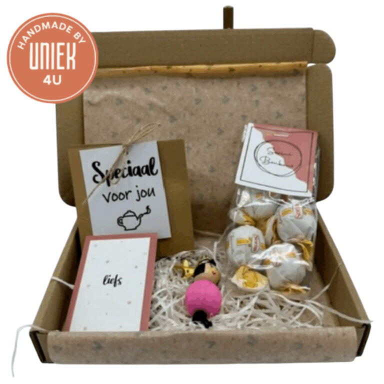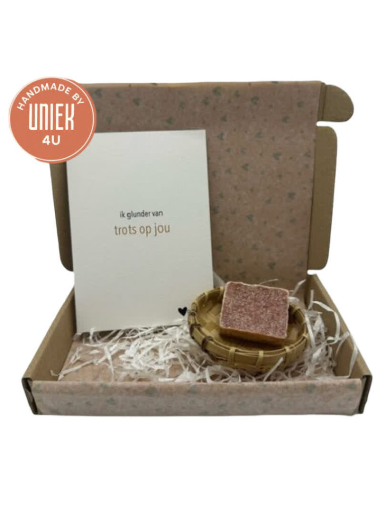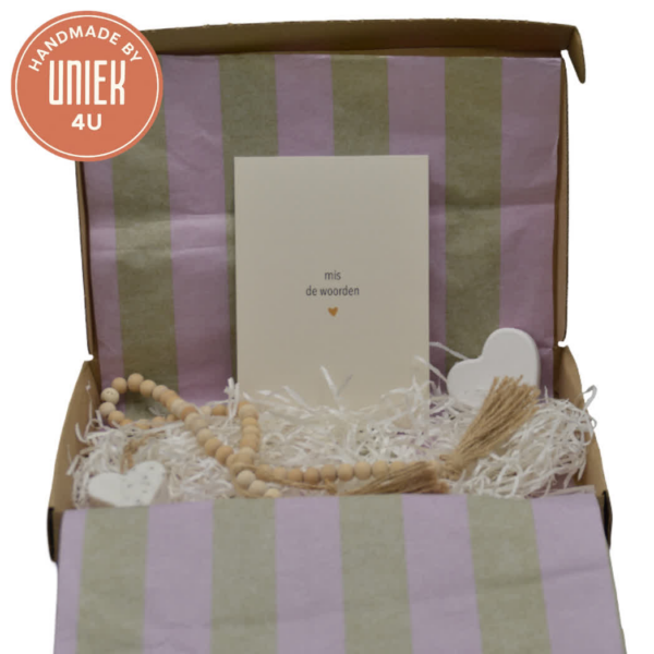 Het Uniek4U brievenbusdoosje “Overlijden” is een handgemaakt rechthoekig doosje van karton met een afmeting van 16,5 x 27 cm. Dit product bevat een kaartje van Hartgedichtje met de tekst “Mis de woorden”, een decoratieve ketting van houten kralen, een gipshartje en een zeephartje. Een zorgvuldig samengesteld en sfeervol doosje om troost te bieden bij verlies.