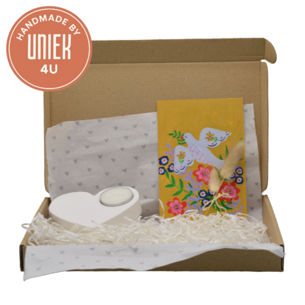 Het Uniek4U brievenbusdoosje Overlijden is een rechthoekig doosje van karton met een afmeting van 27 x 17 cm. Dit handgemaakte brievenbusdoosje bevat een kaart van Kirsten Blom, een droogbloem en een hartvormige houder met theelicht. De combinatie van deze items maakt het doosje tot een stijlvol en betekenisvol gebaar bij een overlijden. Ideaal om per post te versturen als een warm en persoonlijk condoleance cadeau.