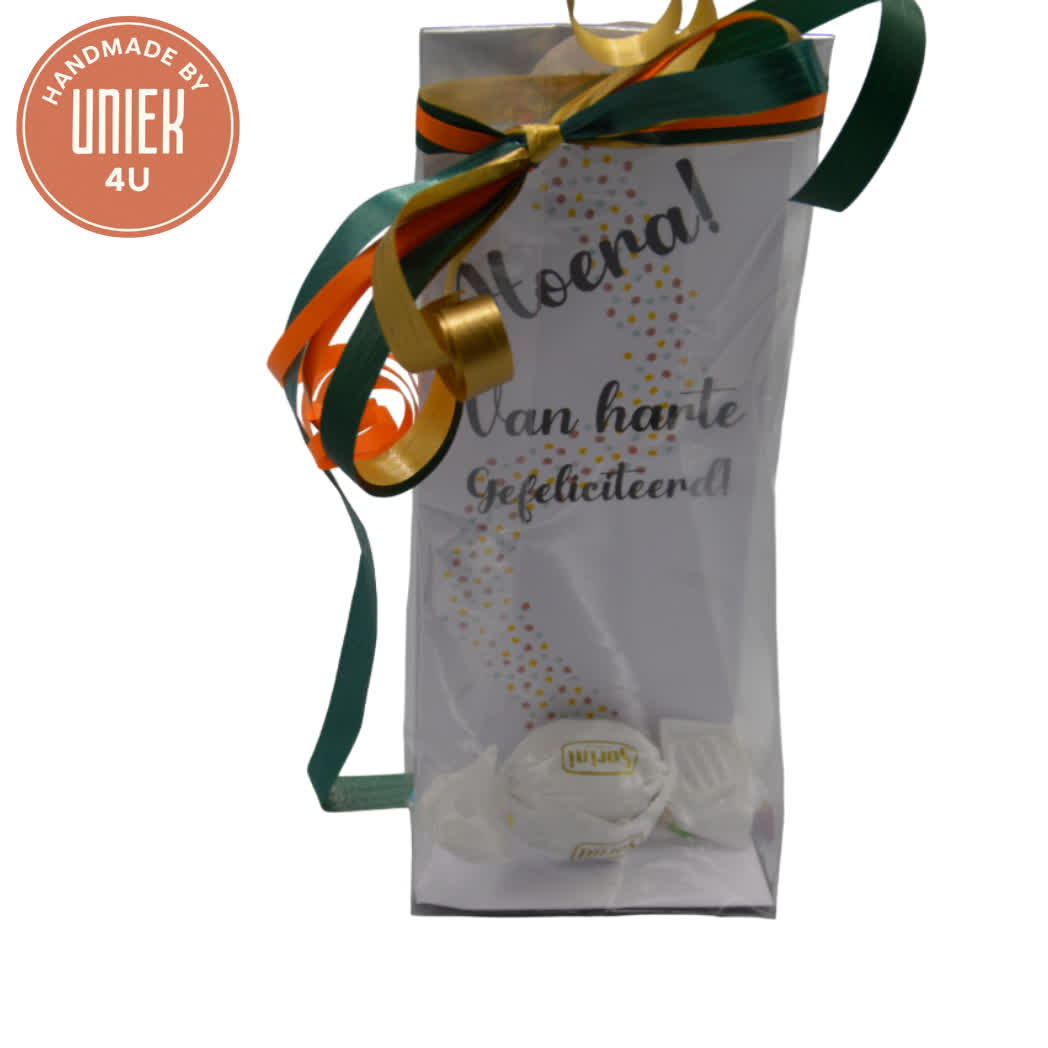 Het Uniek4U cadeauzakje met kaartje en bonbon is een rechthoekig cadeau van 18 x 8 cm, uitgevoerd in de kleur wit en gemaakt van plastic. In het zakje zit een bonbon en een kaartje met de tekst “Hoera! Van harte gefeliciteerd!”. Dit product is compact van formaat en direct klaar om te geven. Een feestelijk en attent cadeautje voor een bijzonder moment.