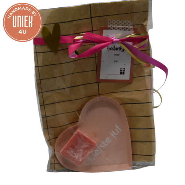 Uniek4U – Roze zeepblokje in bakje met bedankkaartje – Liefste juf