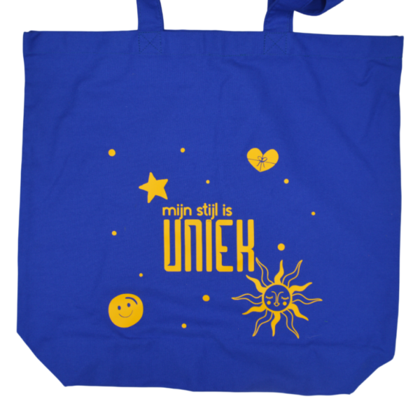 Deze tas met opdruk van Uniek4U is een rechthoekige tas in blauw, gemaakt van katoen. Met een afmeting van 49 x 47 cm en een hengsel van 30 cm is er voldoende ruimte voor dagelijks gebruik. De gele tekst “Mijn stijl is Uniek” en de bijpassende opdruk geven de tas een speelse en persoonlijke uitstraling. Het katoenen materiaal zorgt voor een zachte en natuurlijke look, ideaal voor boodschappen of als stijlvolle draagtas.
