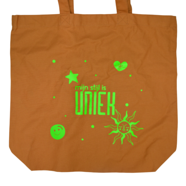 Deze tas met opdruk van Uniek4U is een rechthoekige tas in bruinoranje, gemaakt van katoen. Met een afmeting van 49 x 47 cm en een hengsel van 30 cm is er voldoende ruimte voor dagelijks gebruik. De groene tekst “Mijn stijl is Uniek” en de bijpassende opdruk geven de tas een speelse en persoonlijke uitstraling. Het katoenen materiaal zorgt voor een zachte en natuurlijke look, ideaal voor boodschappen of als stijlvolle draagtas.