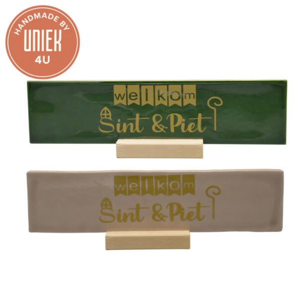 De langwerpige tegel van Uniek met de tekst “Welkom sint & piet” is verkrijgbaar in twee varianten: wit en groen. Met een lengte van 30,5 cm en een hoogte van 7,5 cm is deze decoratieve tegel perfect om neer te zetten of op te hangen. Het ontwerp past helemaal binnen het sinterklaasthema en zorgt voor een warme, feestelijke sfeer in huis.
