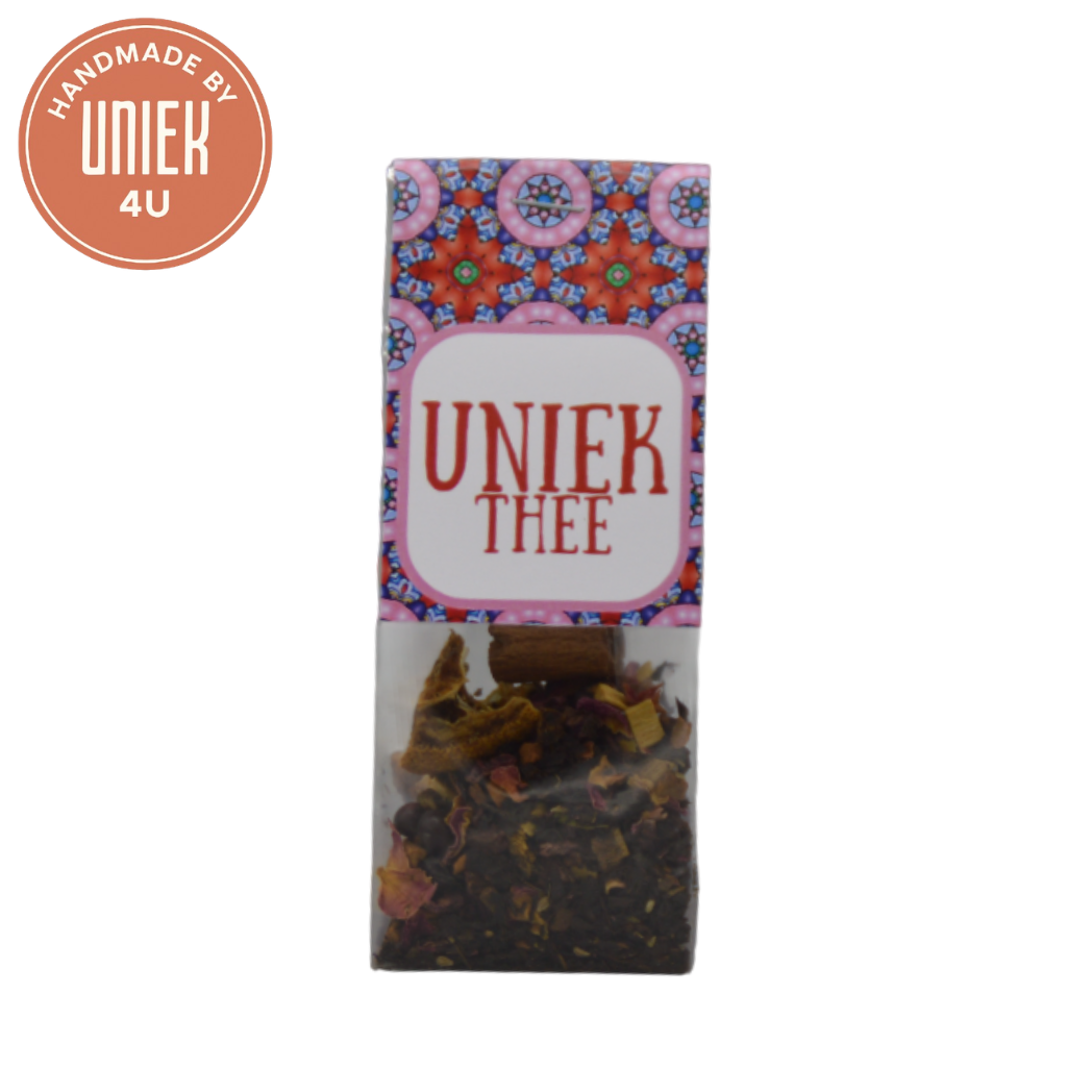 De Uniek4U Uniek thee in zakje is een langwerpige theeverpakking van 14 x 5,5 cm. Deze thee bevat zwarte thee, citroenschil, gehakte amandelen, kruidnagel, aroma, stukjes vanille, rozenbloesemblaadjes en kardemom voor een rijke en kruidige smaakbeleving. Het compacte formaat maakt het zakje geschikt om cadeau te geven of zelf van te genieten. Een aromatische thee met een warme en verfijnde samenstelling.