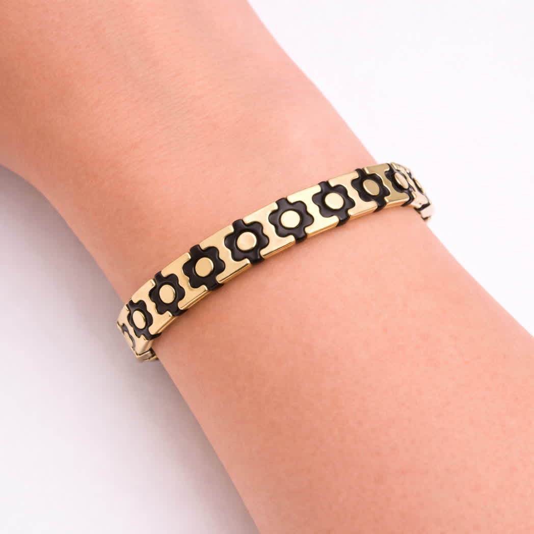 Deze stijlvolle Wauw armband is uitgevoerd in goud met zwarte bloemen en gemaakt van roestvrij staal voor een duurzame en glanzende afwerking. Met een afmeting van 19 x 5 cm is de armband perfect als elegant accessoire voor dagelijks gebruik of als bijzonder cadeau. Het speelse bloemmotief geeft elke outfit een verfijnde en stijlvolle touch.
