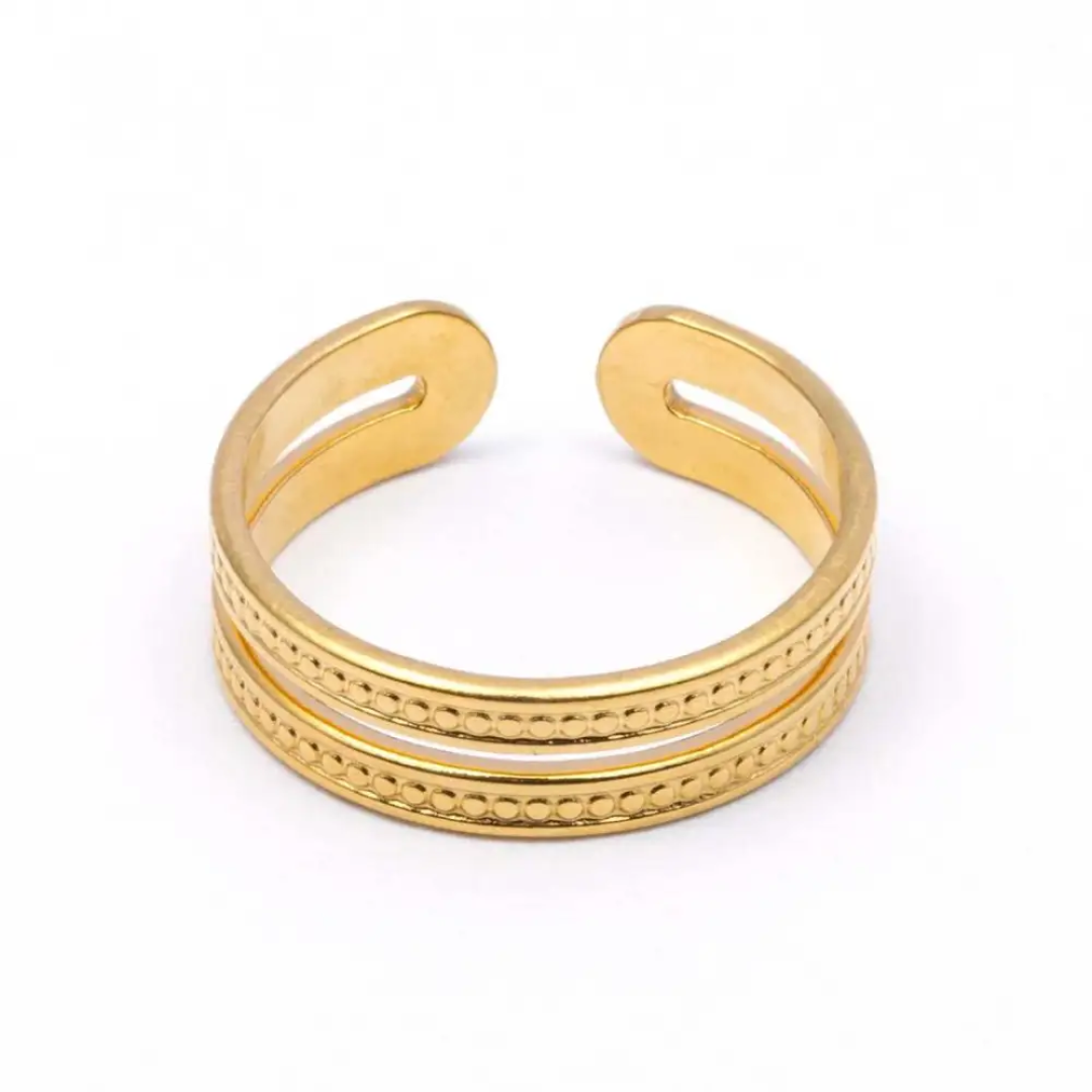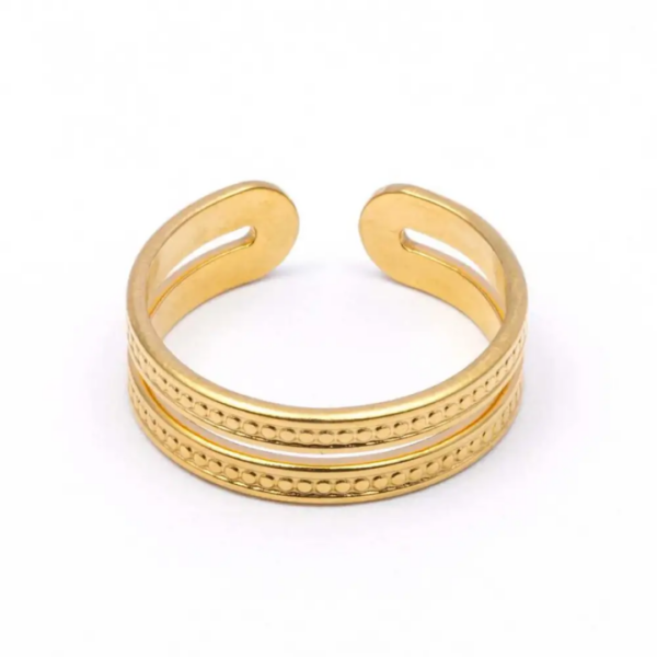 Deze gouden ring heeft een trendy schakel design dat elke look een moderne touch geeft. Gemaakt van roestvrij staal, blijft lang mooi en is duurzaam. De ringvorm zit comfortabel en is makkelijk te combineren met andere sieraden. Verkrijgbaar voor slechts €8,95.
