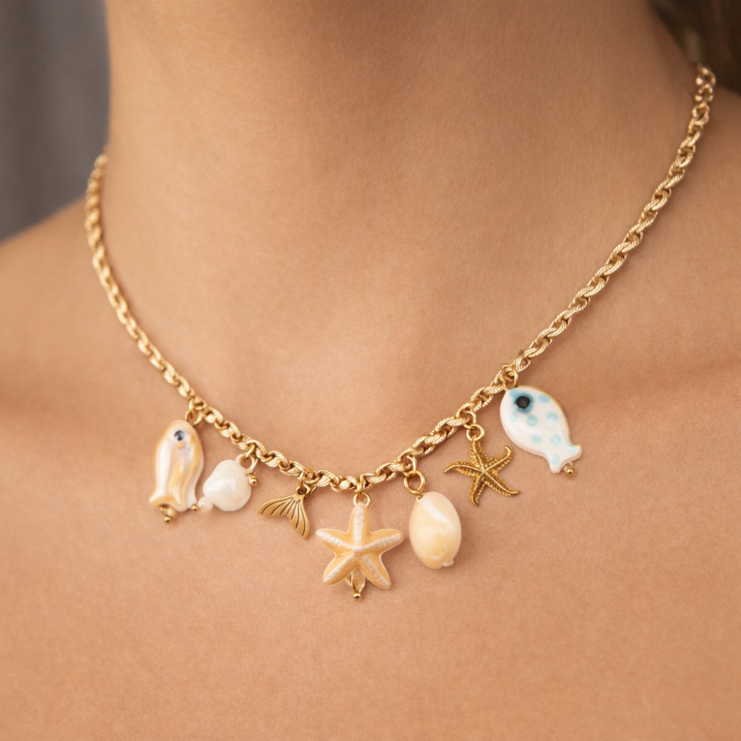 Deze WAUW ketting in oceaan design is uitgevoerd met visjes, schelpjes en zeesterren en heeft een speels, zomers design. De maritieme details geven de ketting een vrolijk en stijlvol accent, ideaal om je outfit extra flair te geven. Een tijdloos en veelzijdig sieraad dat perfect is als dagelijks accessoire of bijzonder cadeau.