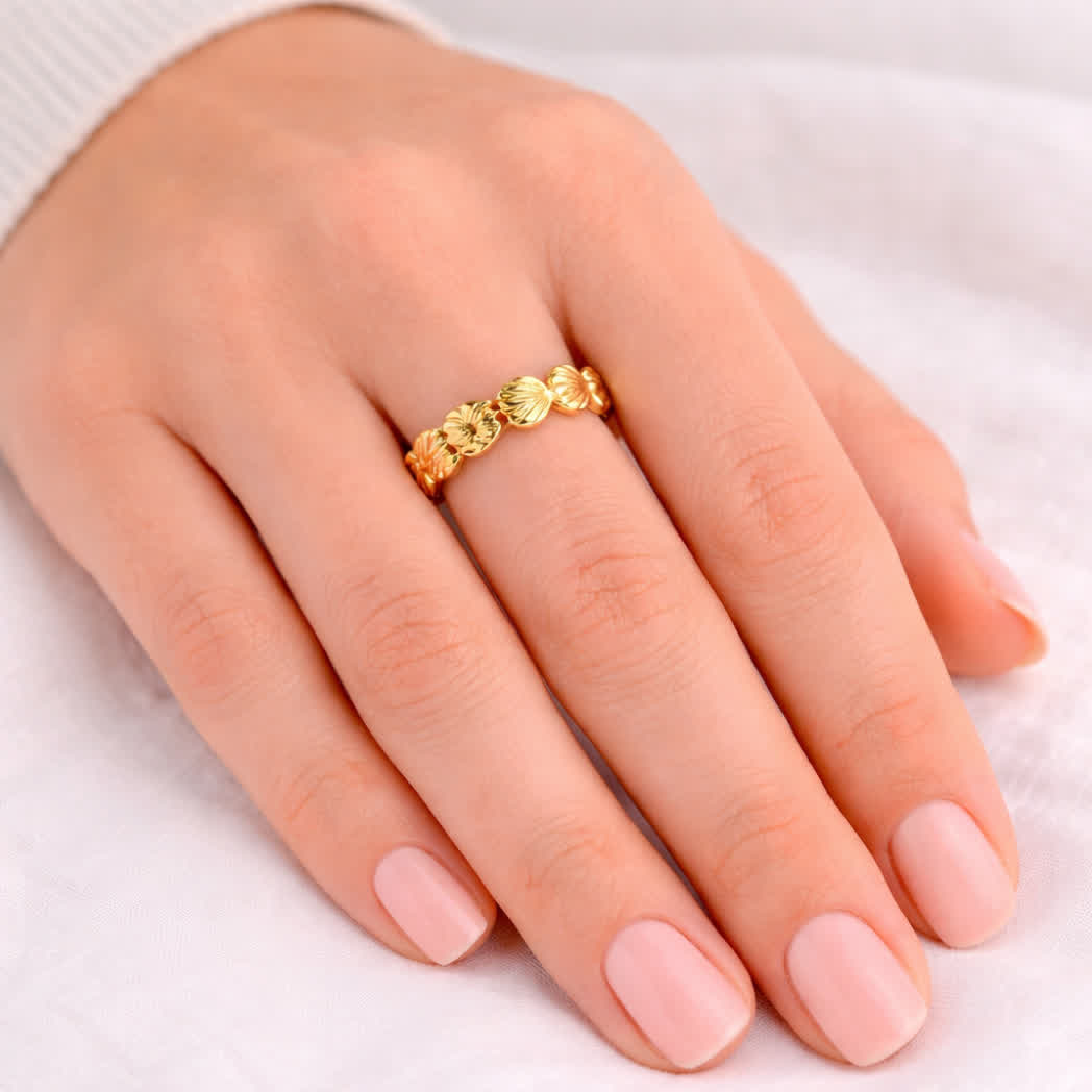 De Wauw ring met kleine schelpjes is uitgevoerd in goud en heeft een subtiel en speels design. De fijne schelpjes geven de ring een stijlvolle, zomerse uitstraling, ideaal als dagelijks sieraad of als bijzonder cadeau. Een charmante toevoeging aan elke sieradencollectie.