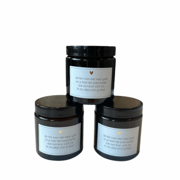 Dit witte waxinelicht zit in een rond bruin glazen potje met deksel. Het compacte formaat van 6×7 cm maakt het ideaal voor elk plekje in huis. Op het glas staat de tekst: “Als het even niet meer gaat en je hebt het even zwaar, dan ben ik er voor jou. Ik sta altijd voor je klaar.” Een warme en betekenisvolle kaars om steun en troost te geven.