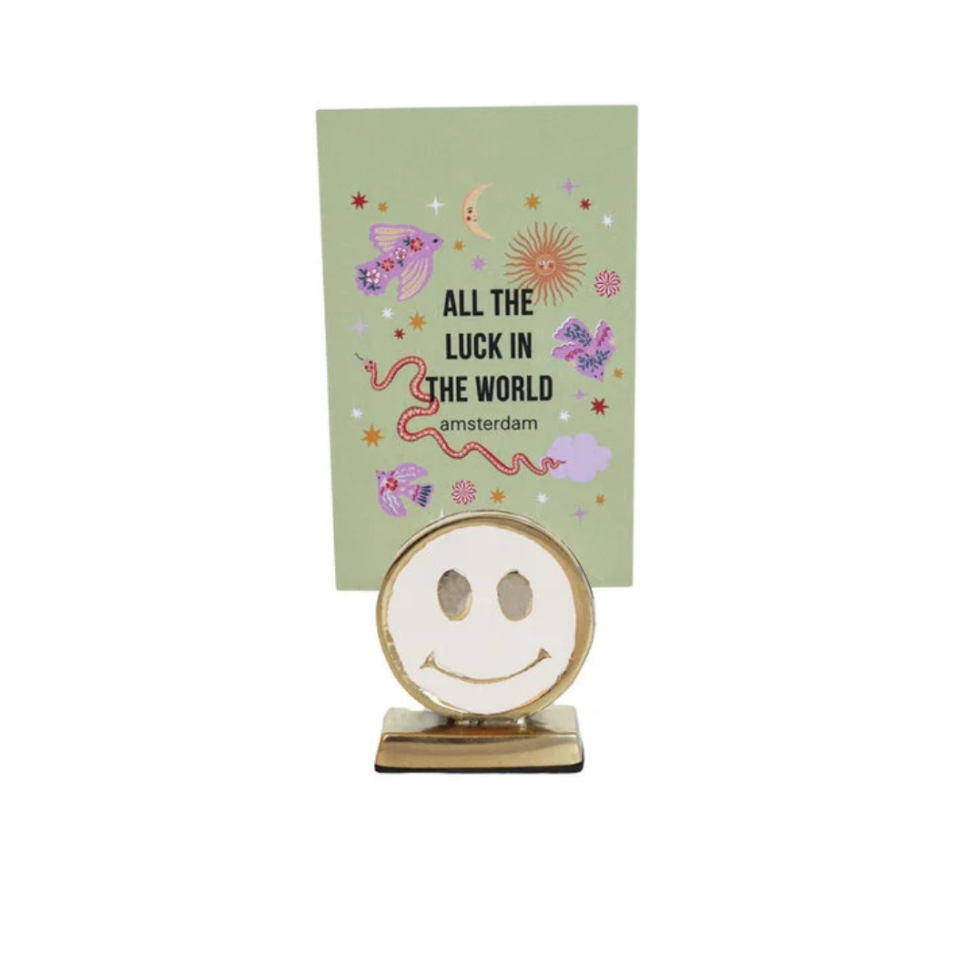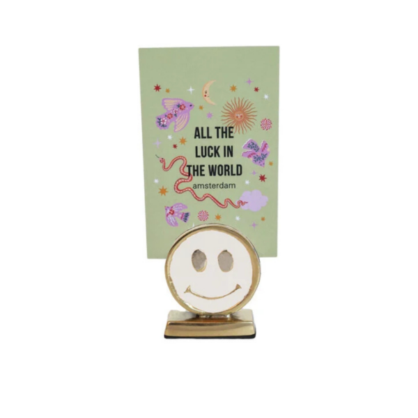 Vrolijke kaarthouder van All the Luck in the World, uitgevoerd in stijlvol wit metaal. Het speelse smiley-design maakt ‘m perfect voor foto’s, ansichtkaarten of kleine notities. Ideaal voor bureau, dressoir of kinderkamer.